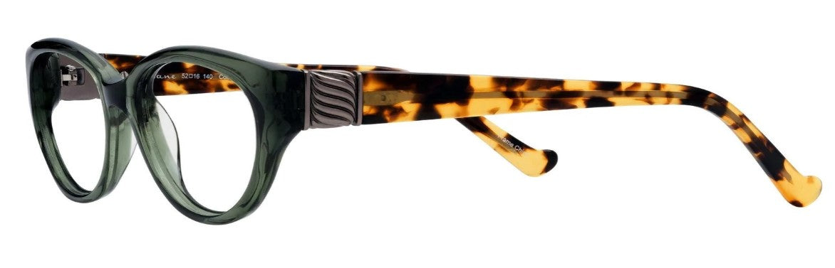 The Jane from Renee's Readers is a hip, slightly pinched cateye shape frame sized for the average female head shape. This distinctive retro-inspired pinched look has a two tone frame offered with either a sheer spuce or sheer purple front offset with tortoise temples. We love the retro inspired temple detail at the front of each frame, tres chic! The frame has built in nose pads that won't hang up when wearing these 'up top'. The spring hinged temples assure a comfortable fit. The scratch resistant CR-39 lenses will serve you well for years to come. This is a contemporary and fun look that will have your friends asking where you got these. Includes a hard case and as always, Free Domestic US shipping. Here are the optical measurements: Lens Width: 52mm, lens height: 34mm, Bridge: 16mm, Temple: 140mm